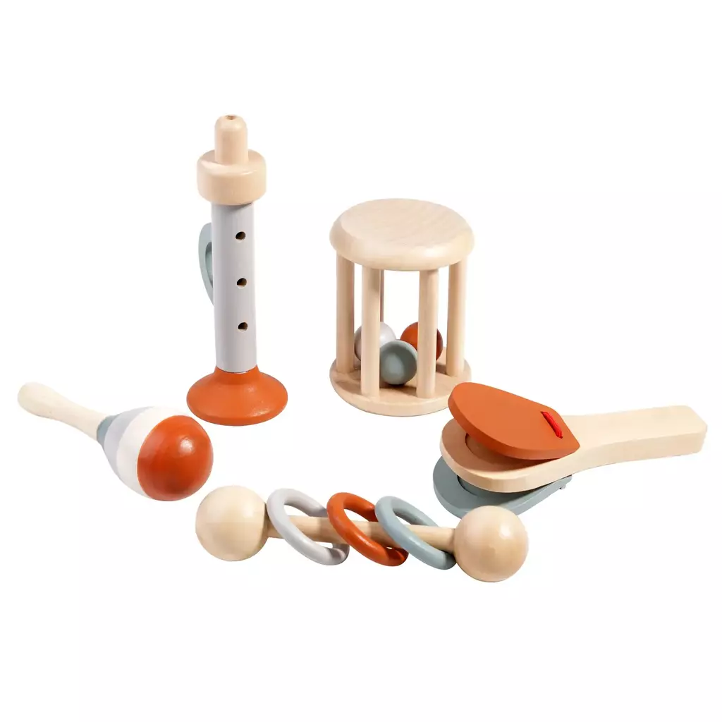 Na fase de 6 meses a 1 ano e meio, a exploração sensorial e a coordenação mão-boca/mão-orelha são o foco do desenvolvimento. O contato com instrumentos simples e naturais estimula o cérebro, facilita o desenvolvimento da linguagem e cria as bases para a concentração. Este conjunto permite que o bebê seja o protagonista da sua própria orquestra, explorando as diferentes texturas e os timbres que cada peça produz.